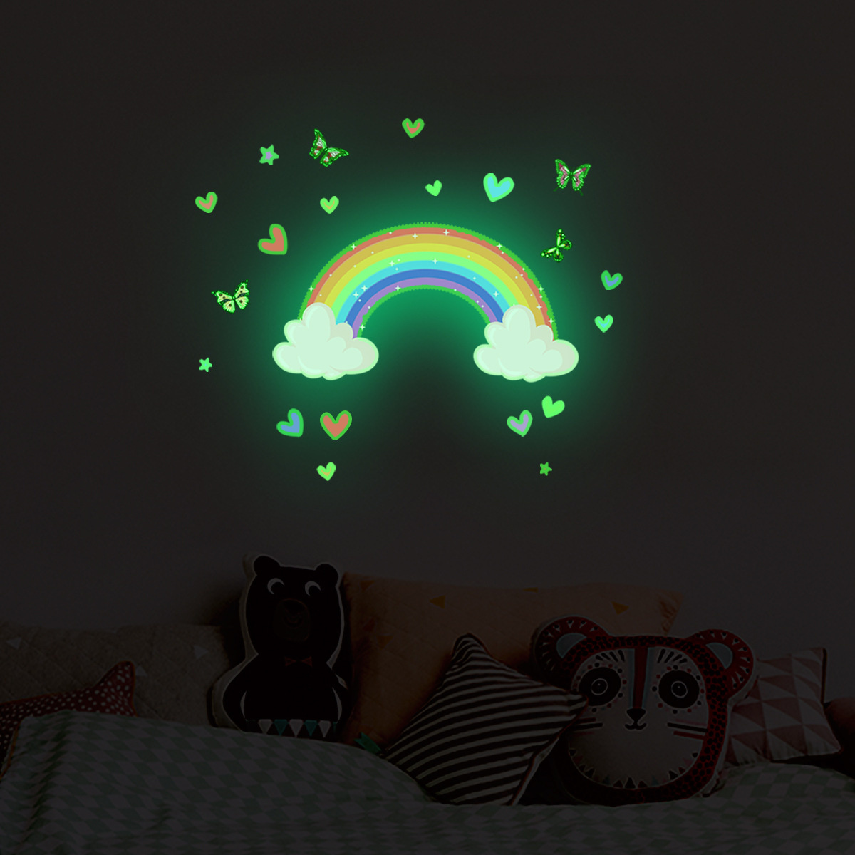 Glow in the Dark Regenboog met wolken Muursticker met Vlinders en Hartjes
