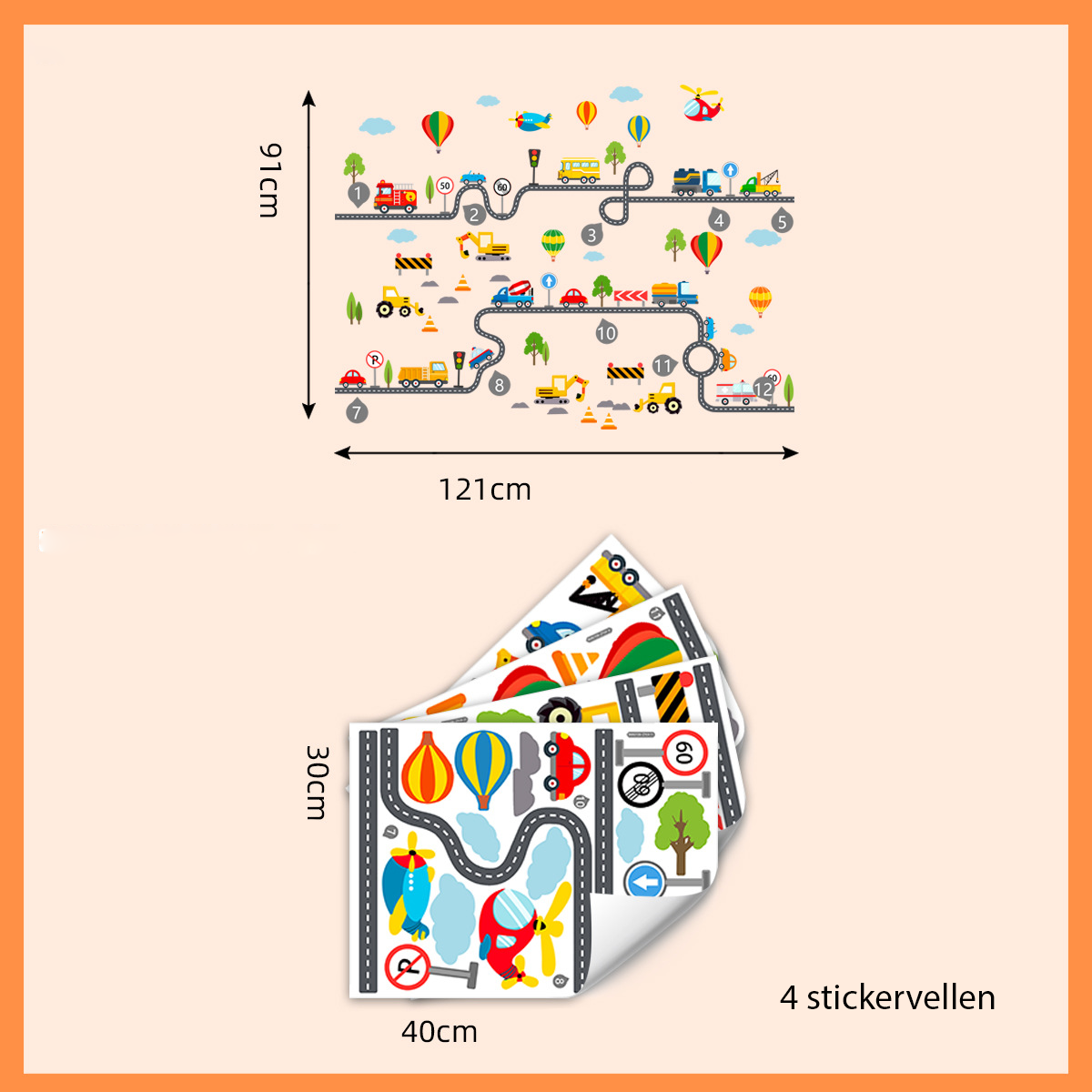 De totale compositie is circa 121 x 91 cm wanneer geplaatst zoals afgebeeld. De sticker wordt geleverd op 4 stickervellen van 40 x 30 cm.