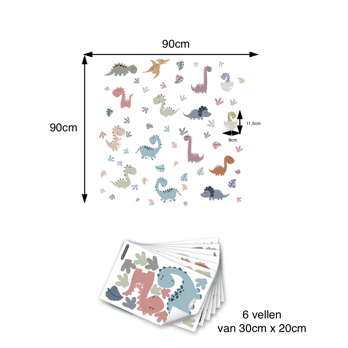 De set wordt geleverd op 6 stickervellen van 30 x 20 cm. De uiteindelijke afmeting hangt af van hoe je de stickers plaatst.