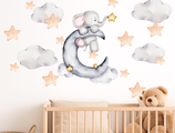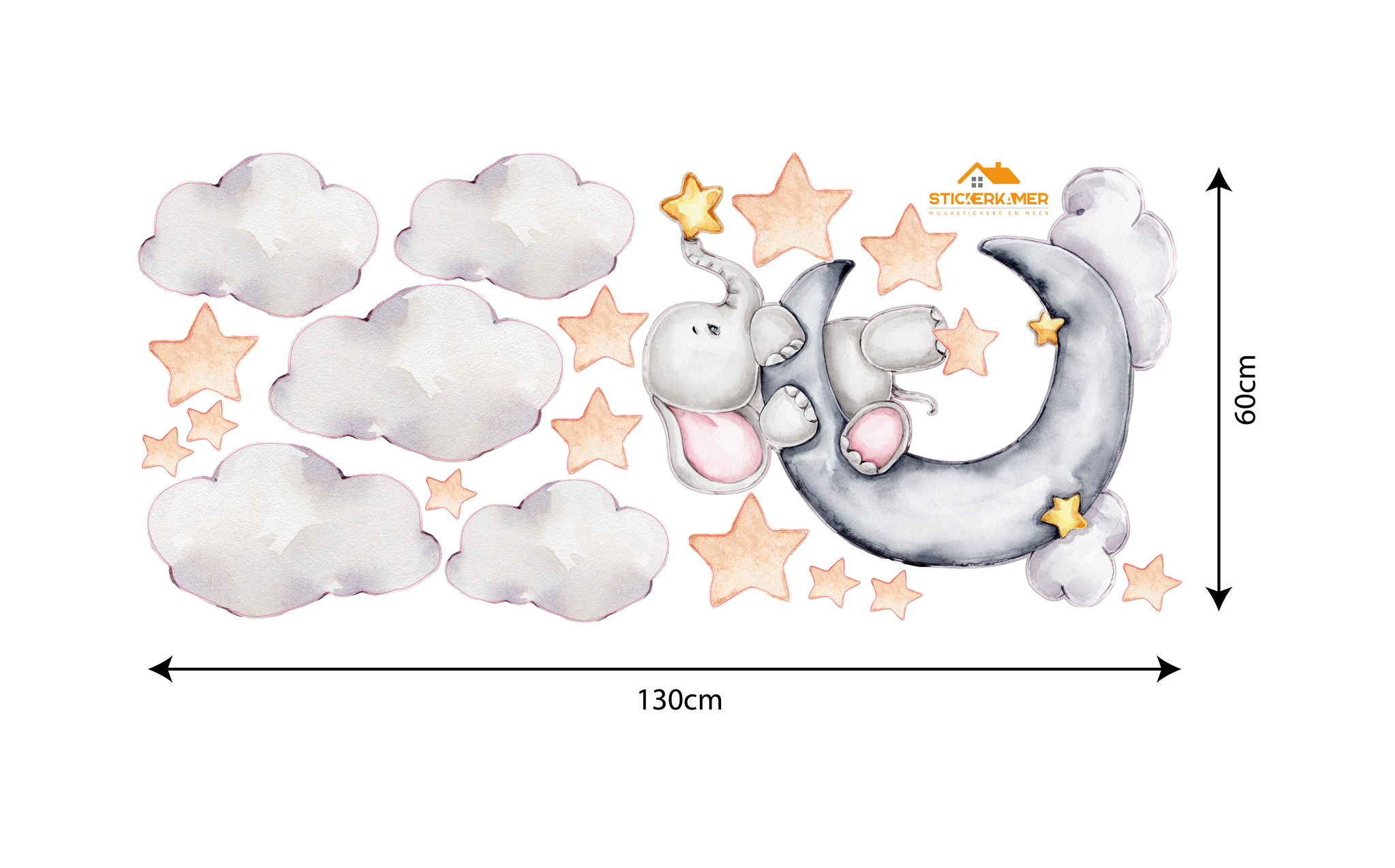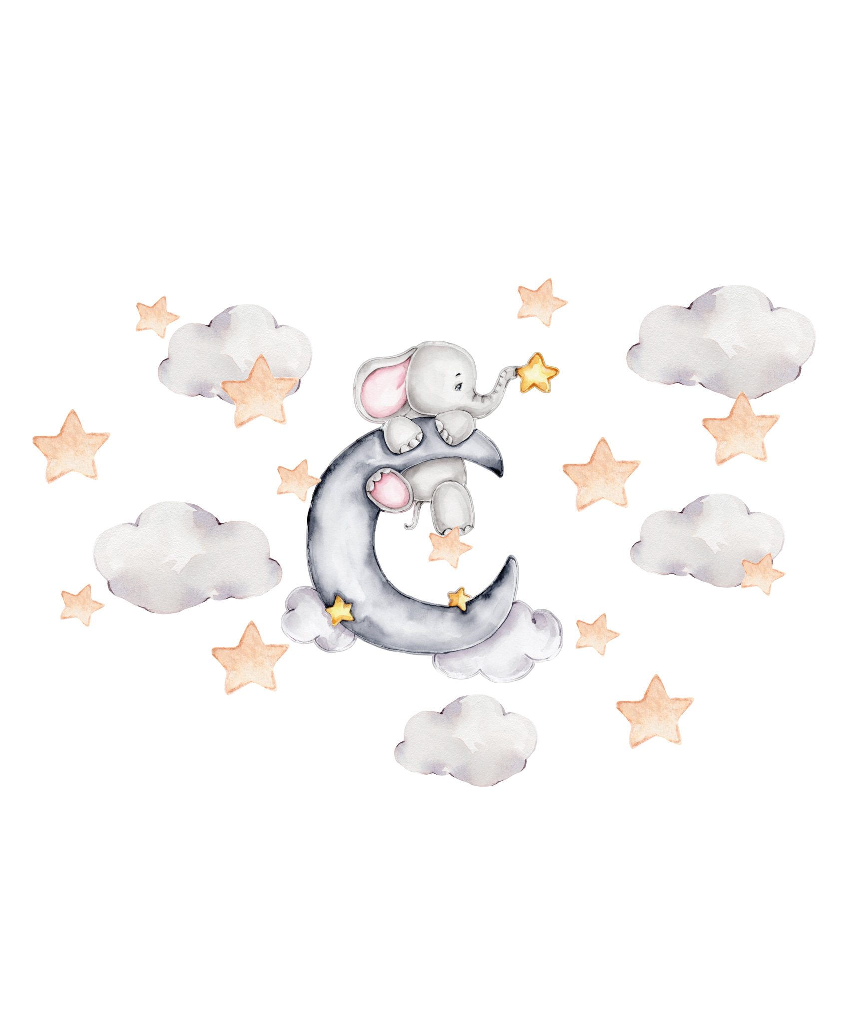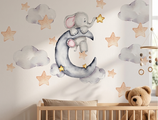 Breng een vleugje magie in de babykamer met deze schattige muursticker van een dromende olifant op een halve maan, omringd door zachte wolkjes en sterretjes. Het aquarel-ontwerp straalt rust en tederheid uit en is perfect voor een liefdevolle en sfeervolle baby- of kinderkamer.