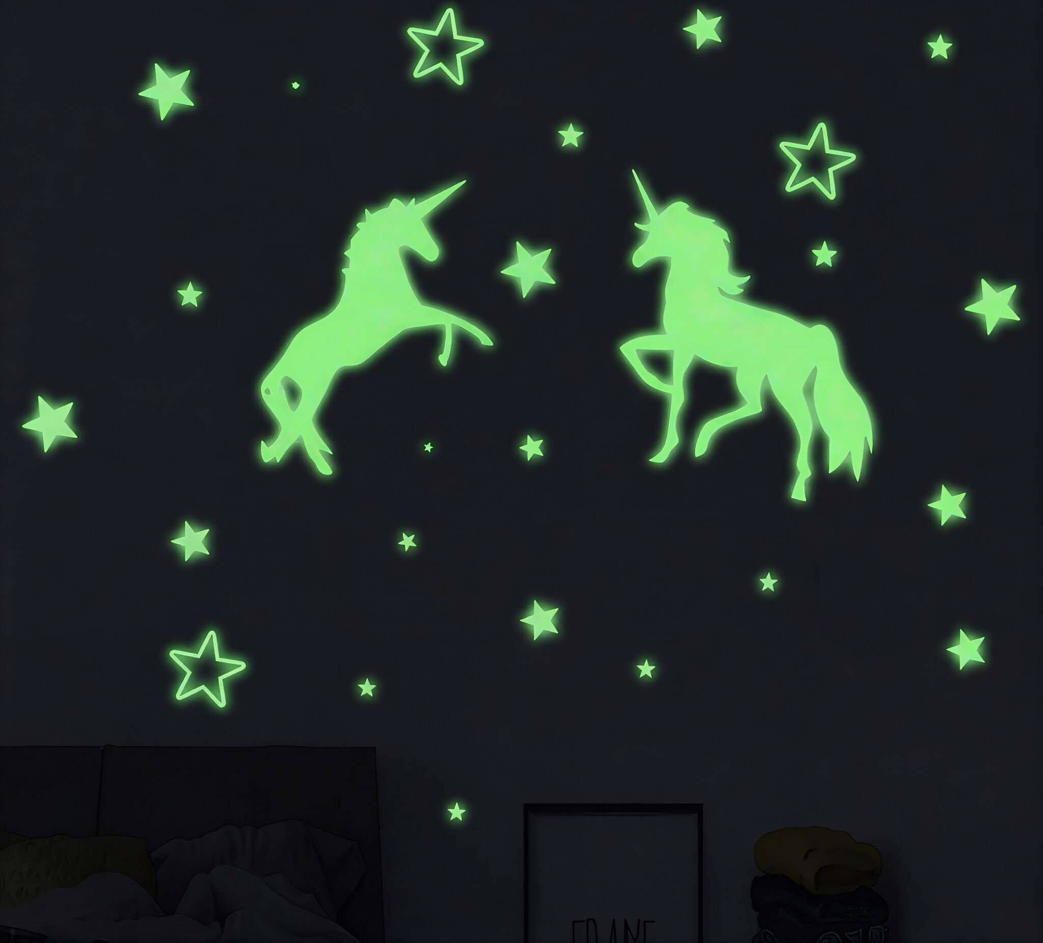 Nooit meer bang in het donker met deze lichtgevende muurstickers unicorn / eenhoorn en sterren