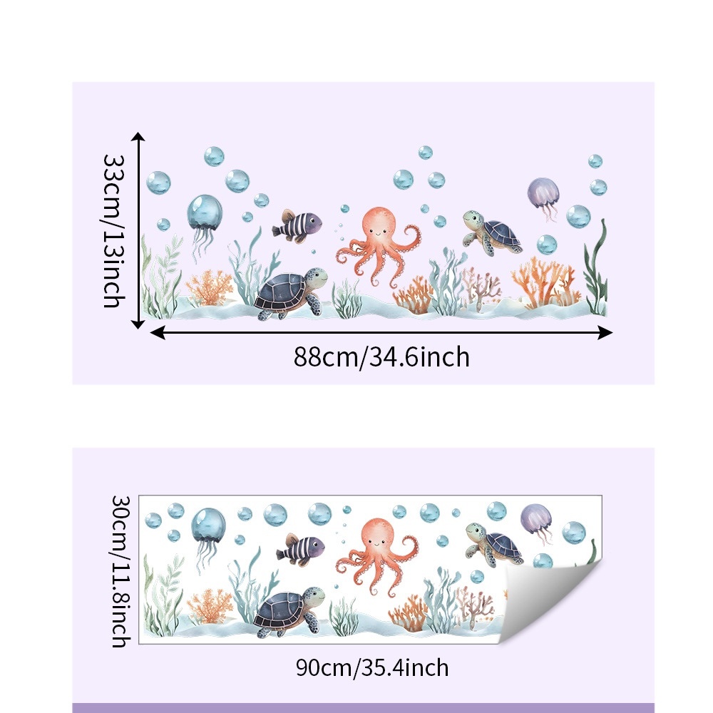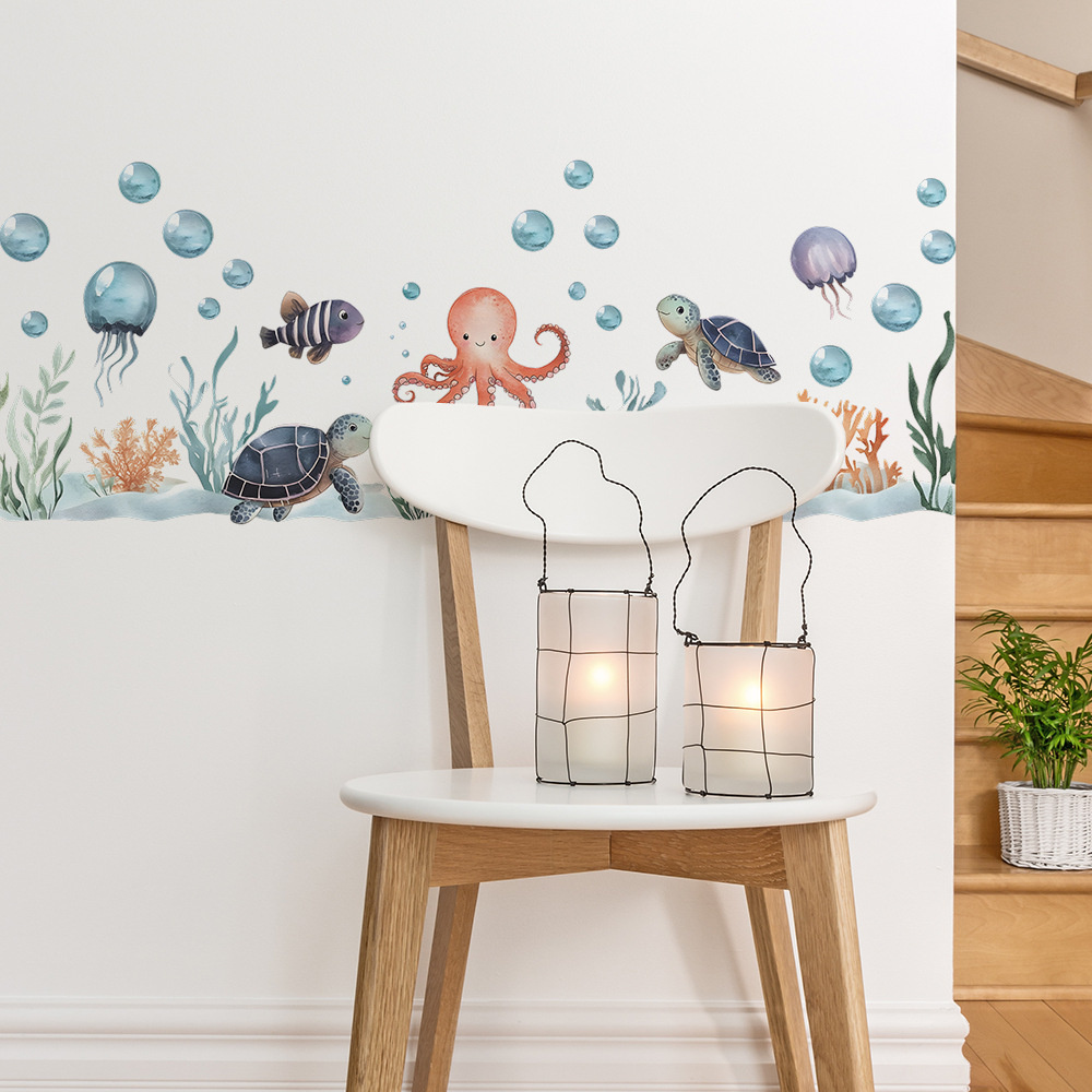 Deze muursticker onderwater oceaan brengt een speelse zeewereld in de kinderkamer of badkamer. De sticker toont een vrolijke octopus, schildpadden, vissen en kwallen met subtiele waterplanten en bubbels.