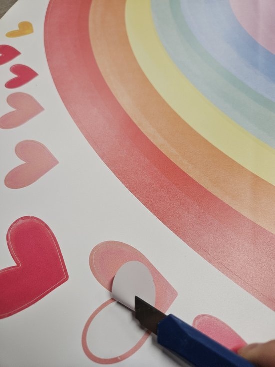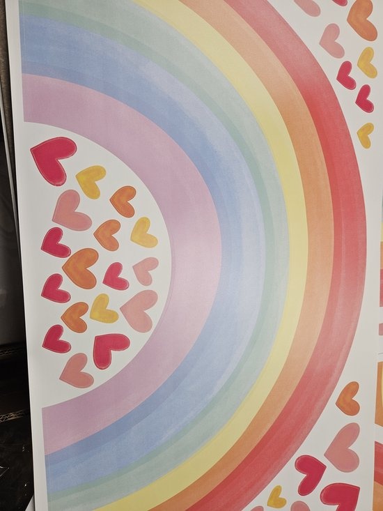 Breng vrolijkheid en kleur in de kamer met deze muursticker van een regenboog met hartjes. Perfect voor de kinderkamer, babykamer of speelhoek. De warme kleuren zorgen direct voor een gezellige en positieve sfeer.