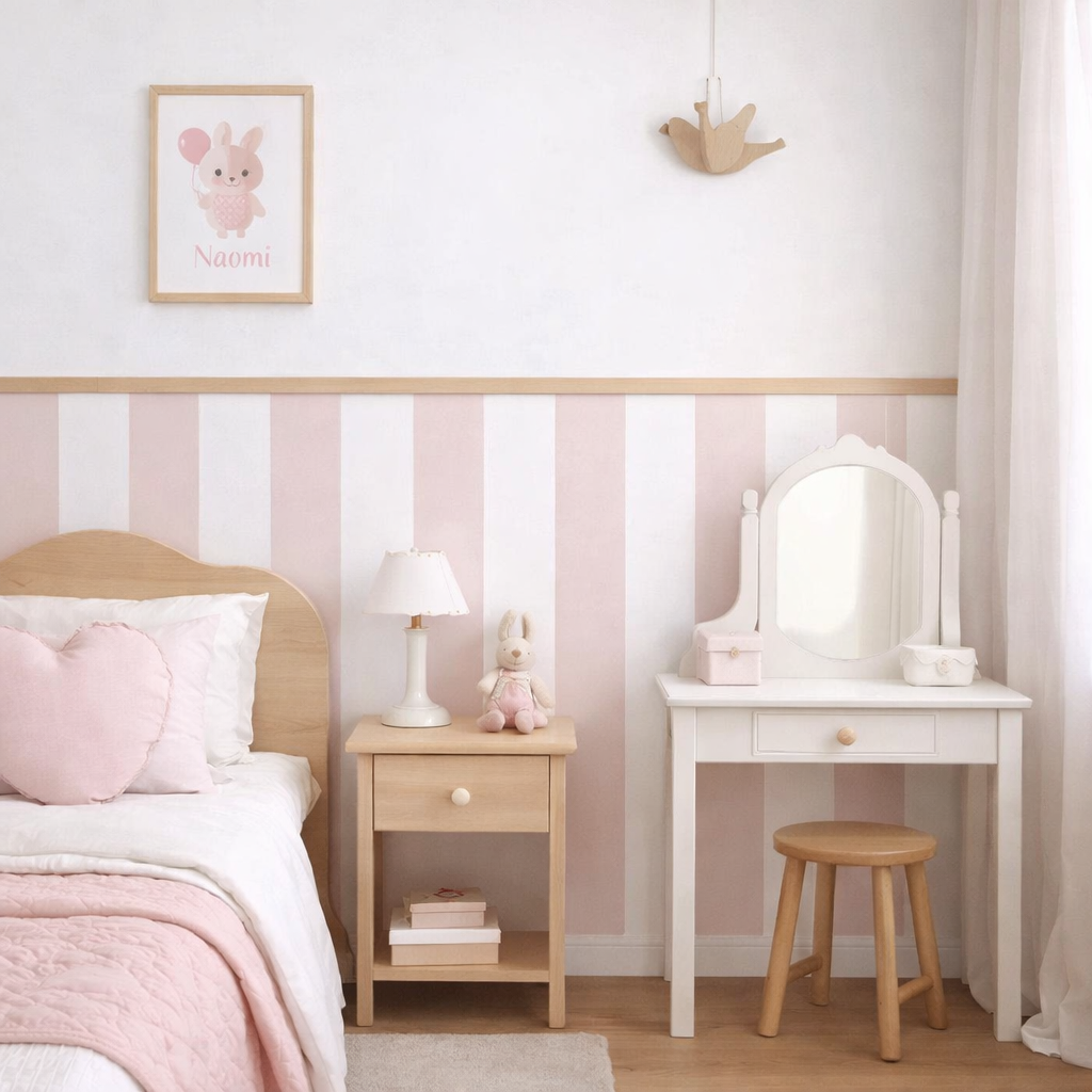 Verwijderbare muursticker-strepen voor lambrisering effect. Mix losse banen tot behanglook; perfect voor meisjes- en kinderkamers. Zonder lijmresten