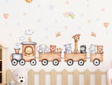 Maak van de kinderkamer een vrolijke speelwereld met deze schattige muursticker. Het design toont een trein vol lieve dieren zoals een leeuw, olifant, giraffe en zebra, aangevuld met wolkjes, sterretjes en ballonnetjes.