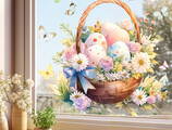 Breng een warme lentesfeer in huis met deze statische paas raamsticker van een gevulde paasmand met kleurrijke eieren en bloemen. De zachte pastelkleuren, vlinders en bloemendetails zorgen voor een sfeervolle en vrolijke paasdecoratie op ieder raam.
