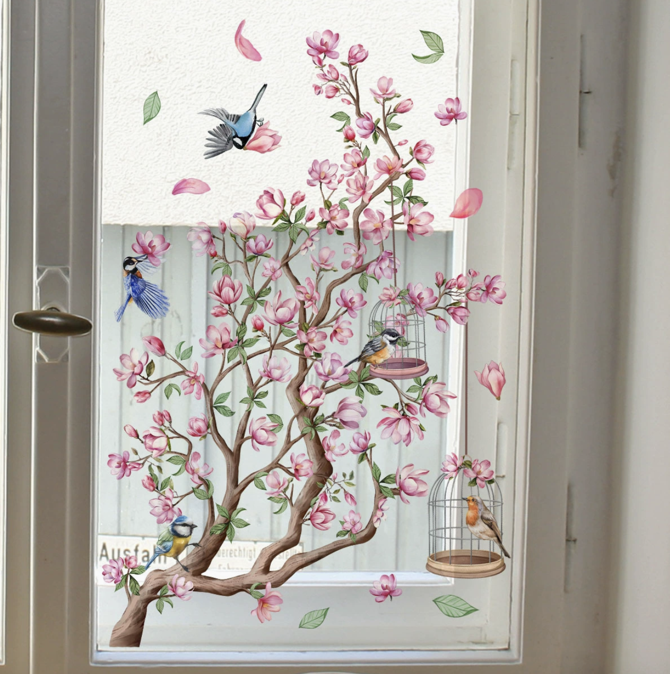 Statische bloesem tak raamsticker met Bloemen, Vogels en Vlinders – Dubbelzijdige Decoratie voor Ramen & Glas