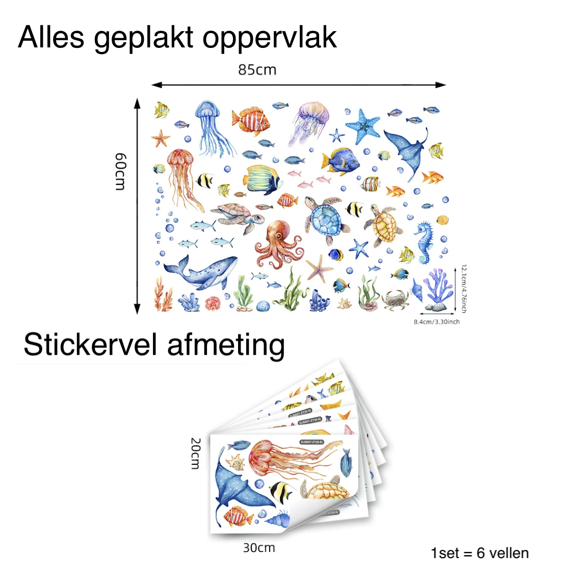 Creëer je Eigen Oceaanvenster: De set bestaat uit meerdere vellen met losse elementen, zodat je de stickers volledig naar eigen inzicht kunt plaatsen en je eigen unieke onderwateravontuur kunt ontwerpen. De totale geplakte oppervlakte kan een indrukwekkende 85 cm x 60 cm beslaan, afhankelijk van je creativiteit.