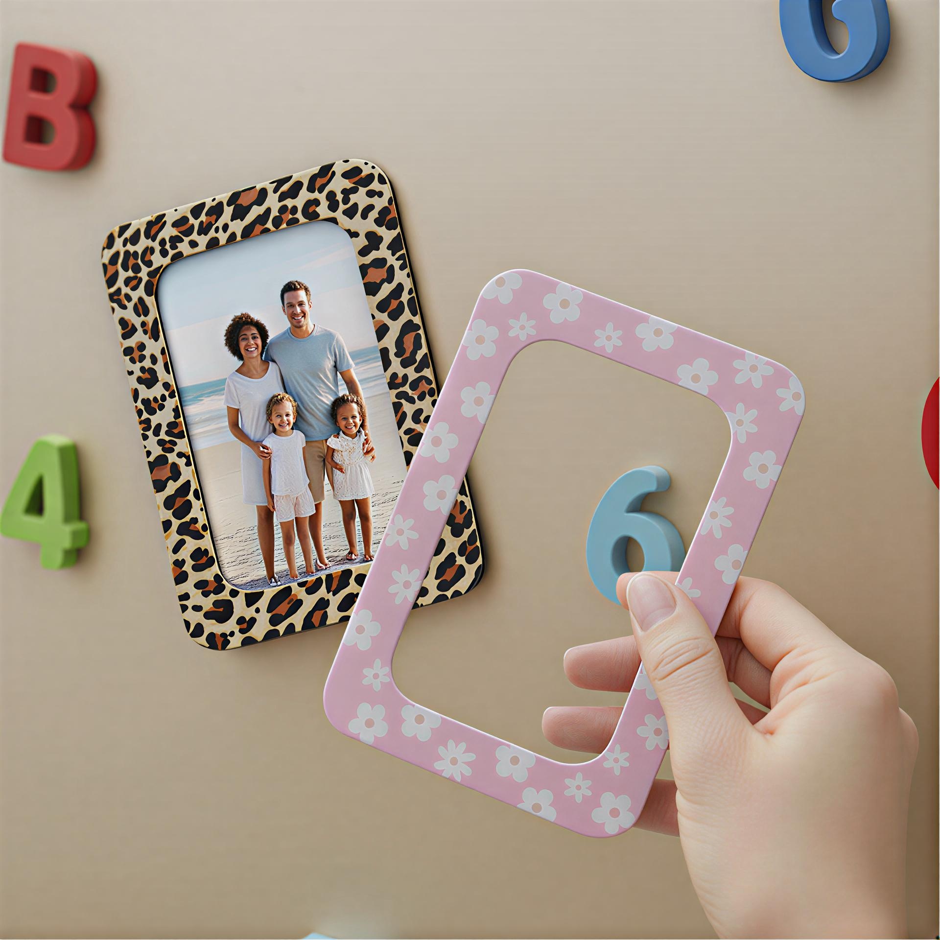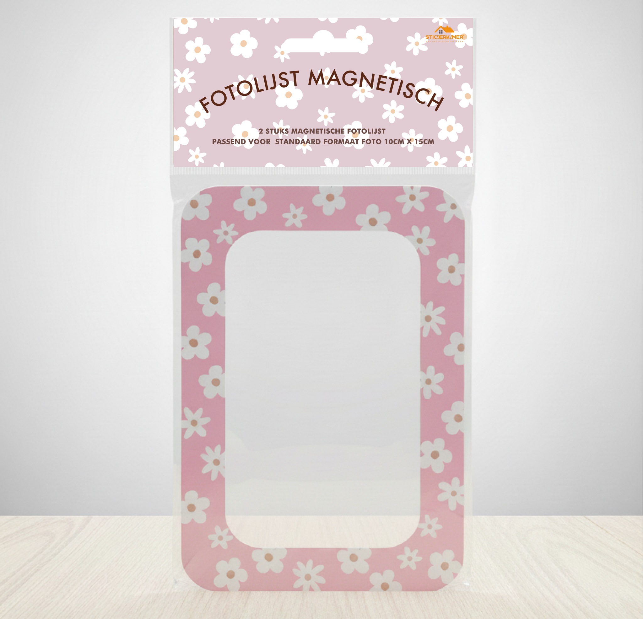 Maak van de koelkast, een metalen kast of magneetsticker een coole, persoonlijke tentoonstelling met deze unieke Magnetische Fotolijsten in stoere Luipaardprint of Daisy bloemen van Stickerkamer!